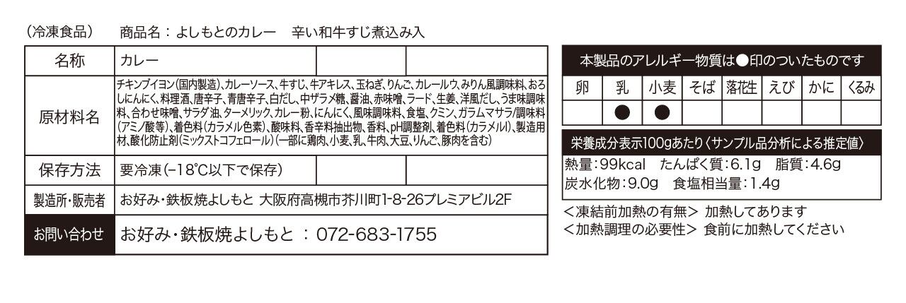 原材料:チキンブイヨン(国内製造)、カレーソース、牛すじ、牛アキレス、玉ねぎ、りんごジュース、カレールウ、みりん風調味料、おろしにんにく、料理酒、唐辛子、青唐辛子、白だし、中ザラメ糖、醤油、赤味噌、ラード、生姜、洋風だし、うま味調味料、合わせ味噌、サラダ油、ターメリック、カレー粉、にんにく、風味調味料、食塩、クミン、ガラムマサラ/調味料(アミノ酸等)、着色料(カラメル色素)、酸味料、香辛料抽出物、香料、酸化防止剤(ビタミンC)、pH調整剤、着色料(カラメルI)、製造用材、酸化防止剤(ミックストコフェロール)(一部に鶏肉、小麦、乳、牛肉、大豆、りんご、豚肉を含む)